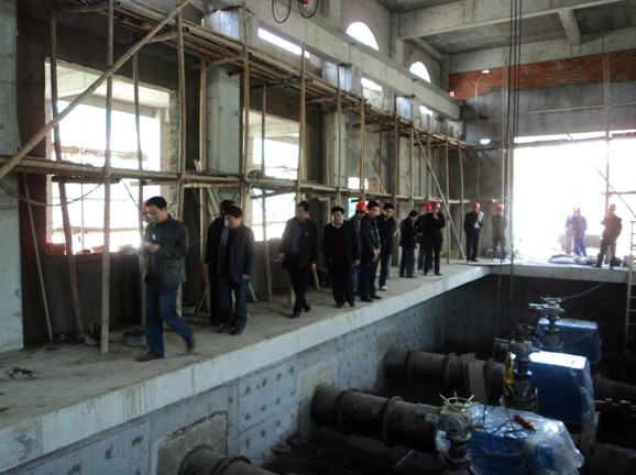 檢查組一行認真查看了施工現(xiàn)場,對泵站主體、進水池、出水池、機電設備安裝等進行了細致檢查,并向施工人員詳細詢問了泵站建設階段的相關技術問題。隨后又對我公司施工資料進行了檢查。