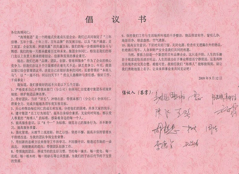 9月12日下午,公司領導及各部門負責人集體在公司發(fā)起的“提高綜合管理水平及自身素養(yǎng)”的倡議書上簽字,號召公司全體員工以更高標準要求自己,以“一屋不掃,何以掃天下?”的主人翁精神和責任感,做好工作,提高業(yè)務水平和自身素養(yǎng),做一個受人尊敬的“海博人”。